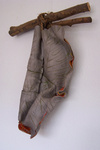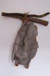 Als gekrulde bladeren - hangende keramische vormen met structuur, aan echte takken bevestigd.
